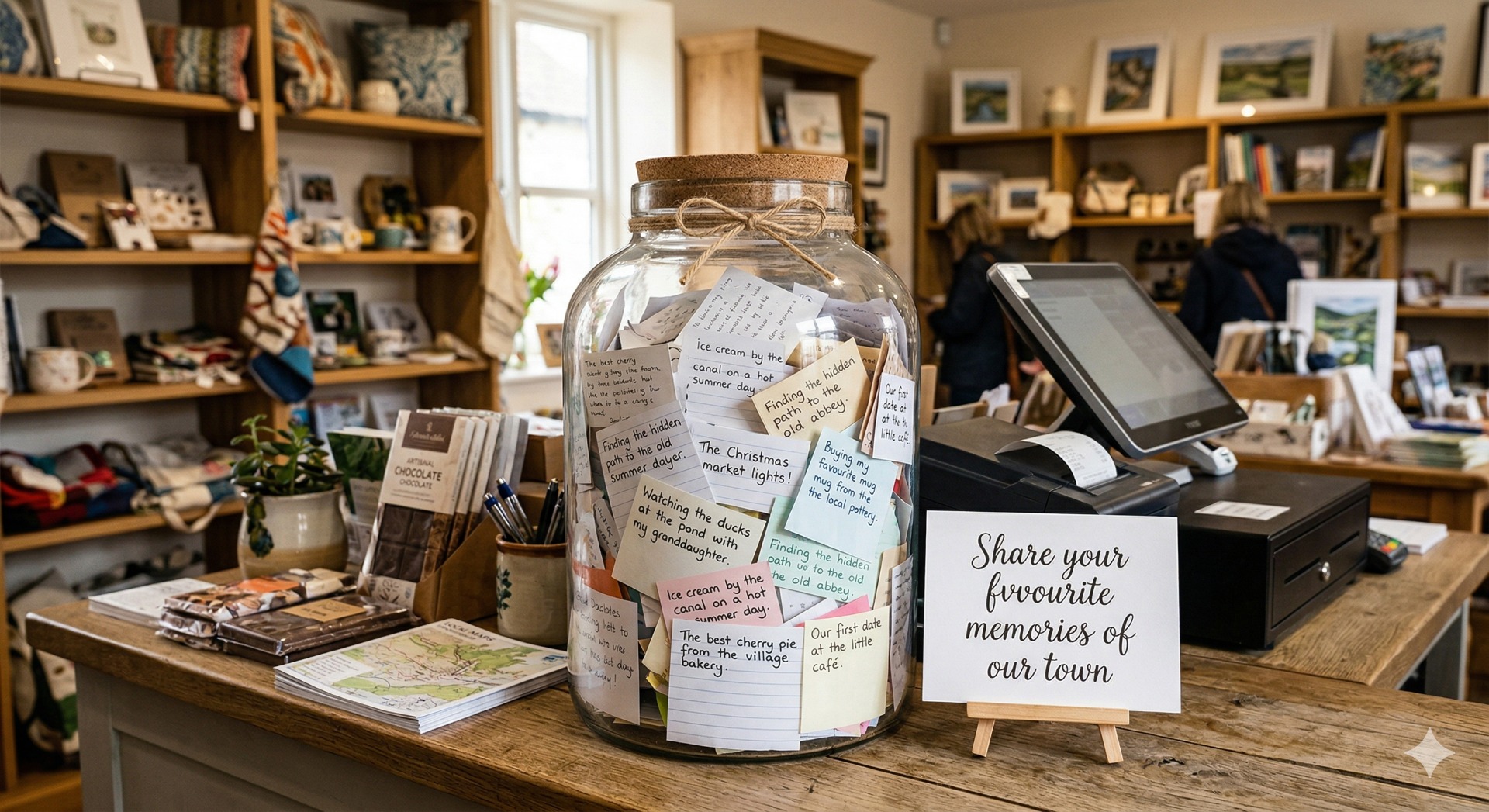 Ask customers to write their favourite memory of a time in the town on a piece of paper or card and place it in a jar.